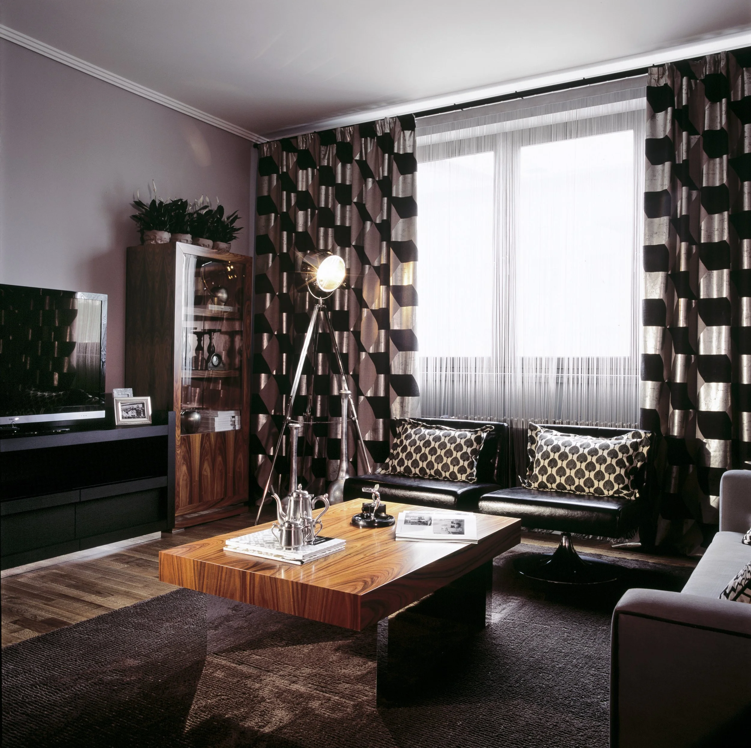 In this apartment, the combination of bright graphic ornaments, black details, velvet, mirrors, and cherry wood creates a harmonious ambiance.